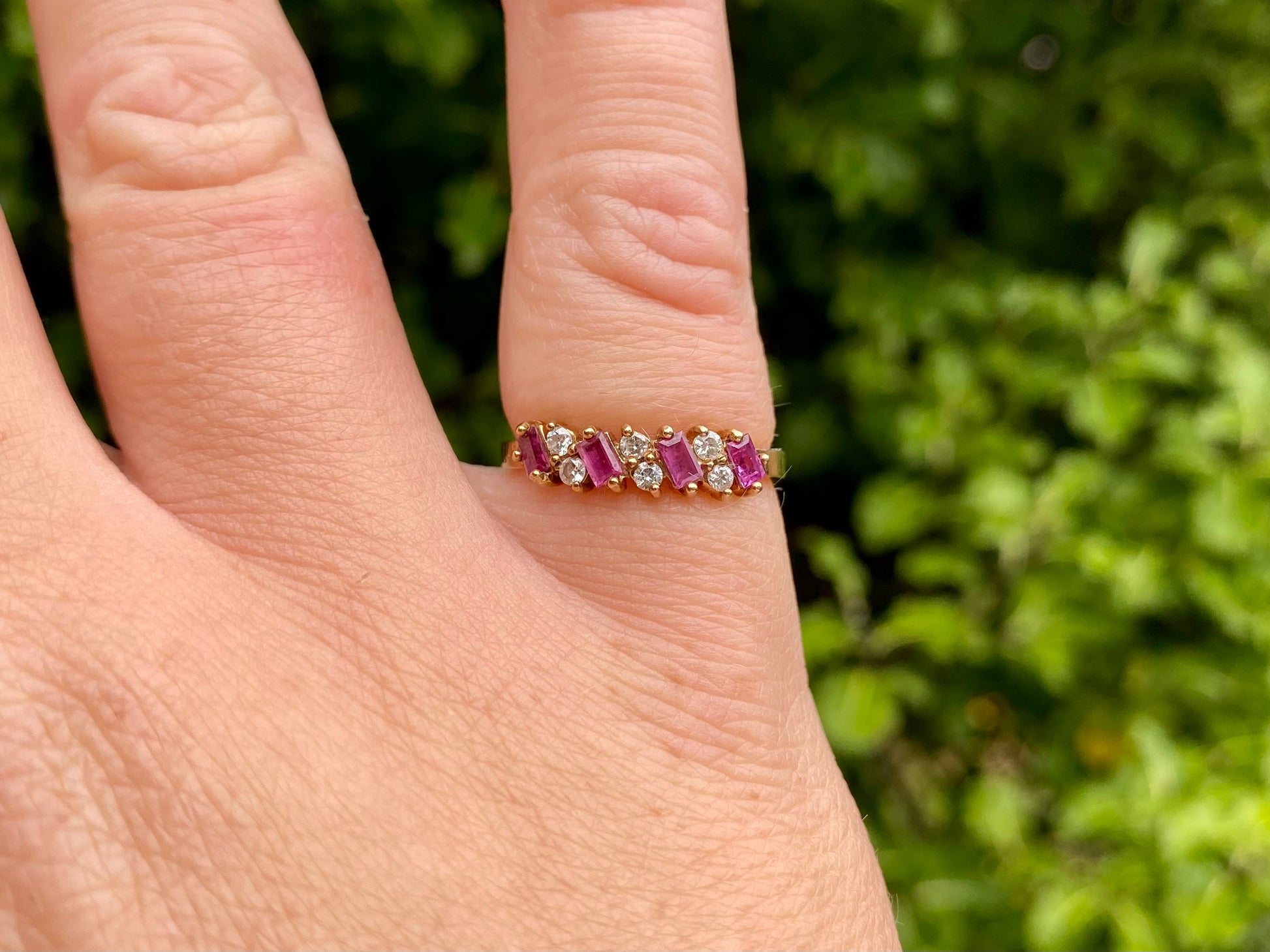 The front of the ring measures 4mm wide and features four baguette-cut rubies and six round-cut diamonds.