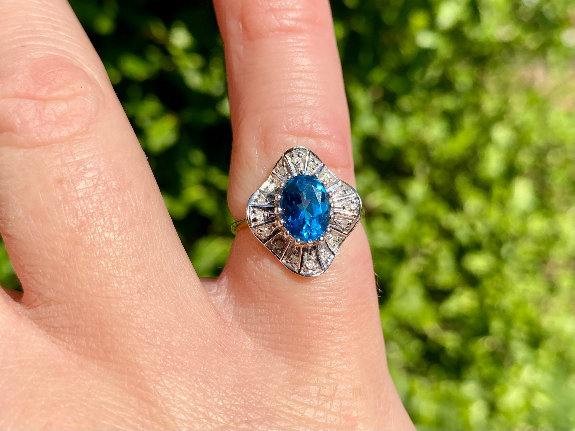 The face of the ring measures 16 x 14mm and fetaures a 8 x 6mm oval topaz and sixteen small round diamonds set into white gold. The band of the ring is yellow gold.