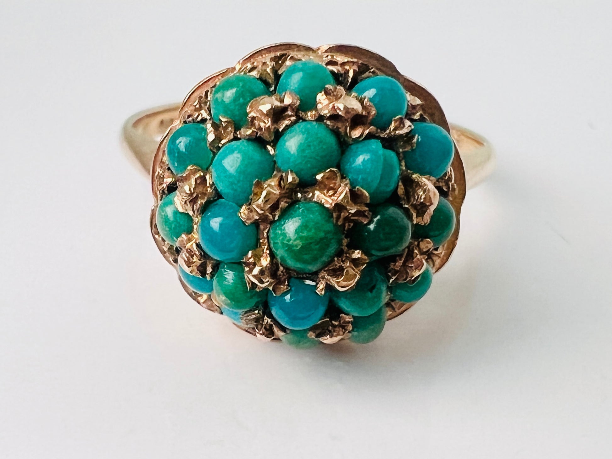 The face of the ring measures 11mm across and is set with round turquoise. The colour of the gold is a very mellow yellow/rose gold colour often seen with vintage antique items.